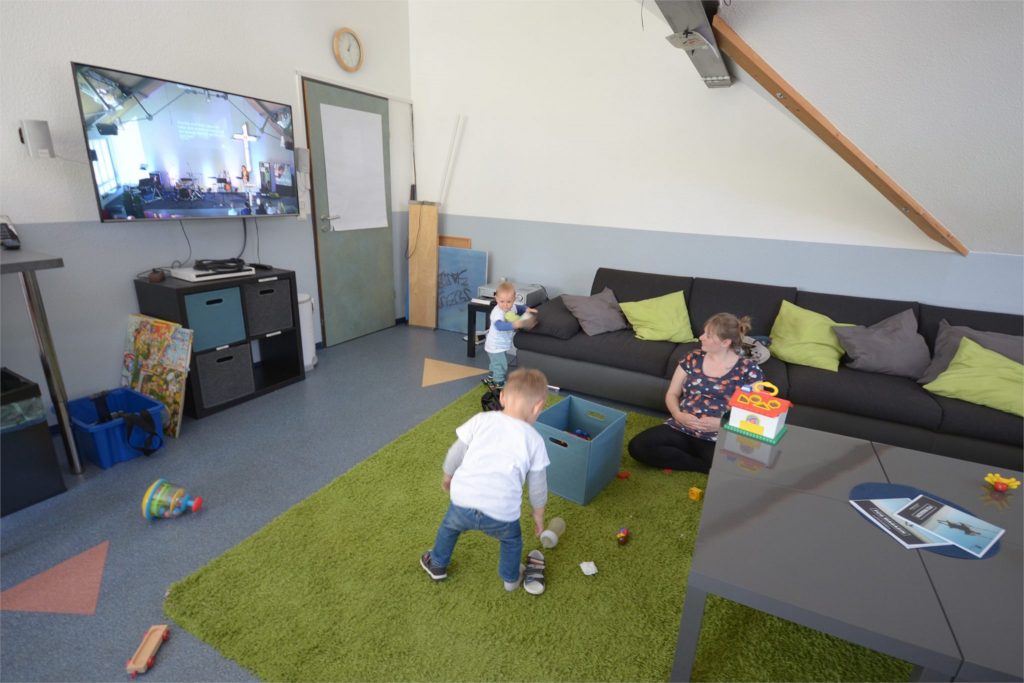 Wenn du Kinder im Alter von 0 bis 3 Jahren hast, ist bestens für euch gesorgt. Im Obergeschoss findest Du den Eltern-Kind-Raum mit Live-Übertragung des Gottesdienstes und genügend Spiel- und Malsachen für die Kleinen. Selbst wenn mal der Spontanhunger kommt und du nichts dabeihaben solltest, helfen wir dir mit einer kleinen Mahlzeit aus. Auch eine Küchenzeile mit Wasserkocher steht dir zur Verfügung.